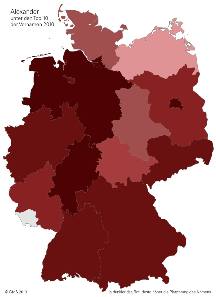 Je dunkler der Farbton, desto höher die Platzierung innerhalb der Top Ten. Grau gefärbt sind jene Bundesländer, in denen der Name nicht unter den Top Ten steht.