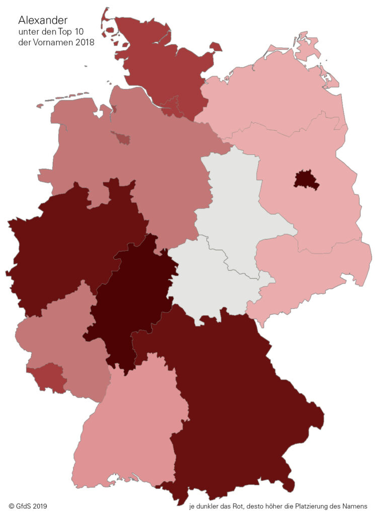 Der Name Alexander – obwohl viel älter – fand im Mittelalter Eingang in die deutsche Namensgebung und wird seit jeher recht konstant vergeben. In den 1960er Jahren entwickelte er sich zu einem der beliebtesten Jungennamen in Deutschland, was sich seitdem nur unwesentlich verändert hat: Auf der Liste der beliebtesten Vornamen der GfdS belegt Alexander als einziger Name in jedem Jahrgang seit 1977 einen Platz unter den Top 10, vielfach sogar unter den Top 3. Aktuell belegt er Platz 2 unserer Gesamtliste und wird besonders als Zweitname äußerst gern vergeben.