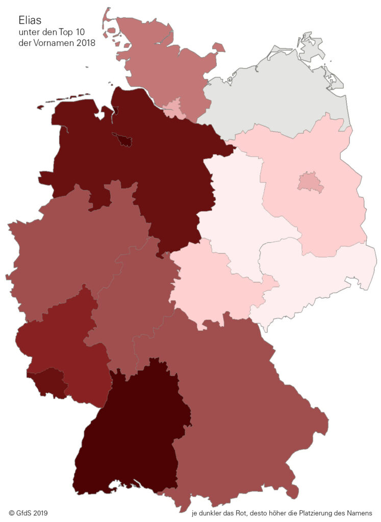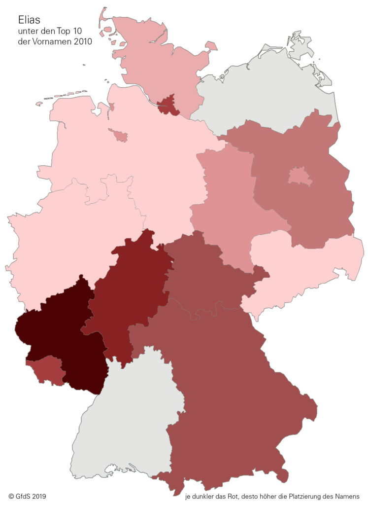 Je dunkler der Farbton, desto höher die Platzierung innerhalb der Top Ten. Grau gefärbt sind jene Bundesländer, in denen der Name nicht unter den Top Ten steht.