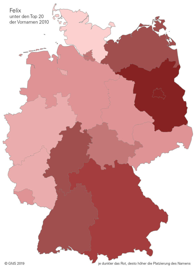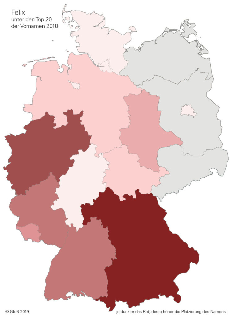 Je dunkler der Farbton, desto höher die Platzierung innerhalb der Top Ten. Grau gefärbt sind jene Bundesländer, in denen der Name nicht unter den Top Ten steht.