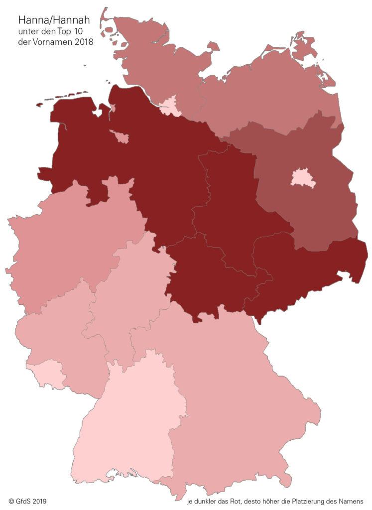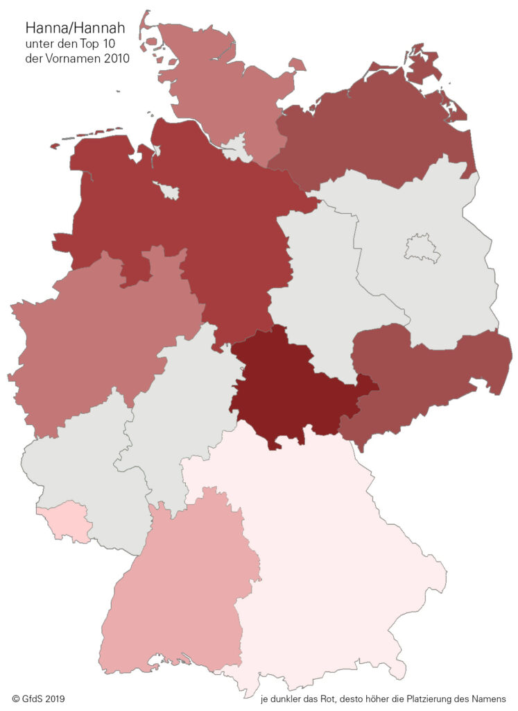 Je dunkler der Farbton, desto höher die Platzierung innerhalb der Top Ten. Grau gefärbt sind jene Bundesländer, in denen der Name nicht unter den Top Ten steht.