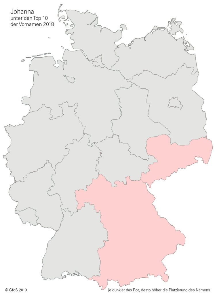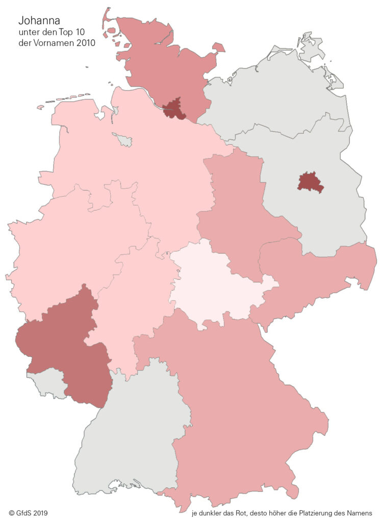 Je dunkler der Farbton, desto höher die Platzierung innerhalb der Top Ten. Grau gefärbt sind jene Bundesländer, in denen der Name nicht unter den Top Ten steht.