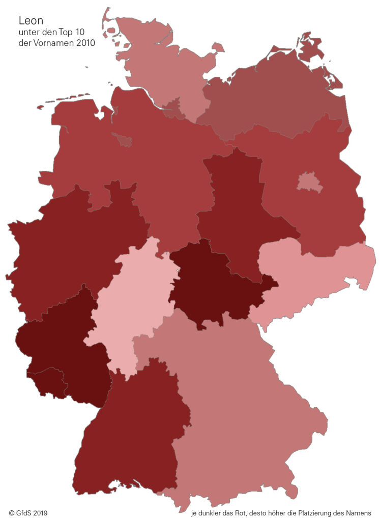Je dunkler der Farbton, desto höher die Platzierung innerhalb der Top Ten. Grau gefärbt sind jene Bundesländer, in denen der Name nicht unter den Top Ten steht.