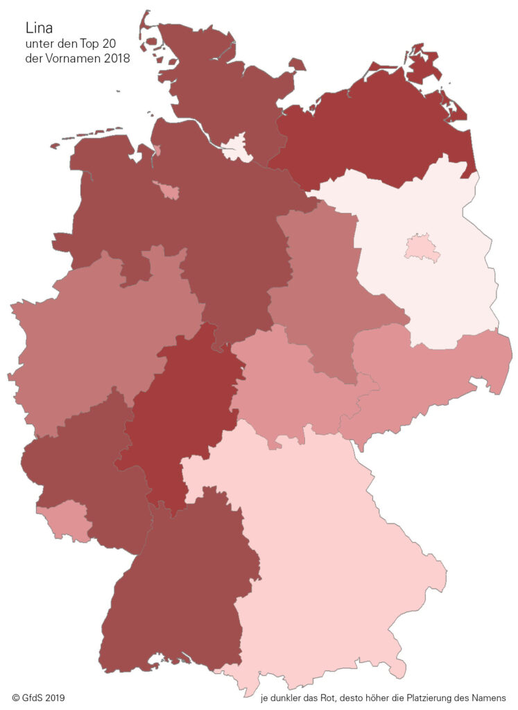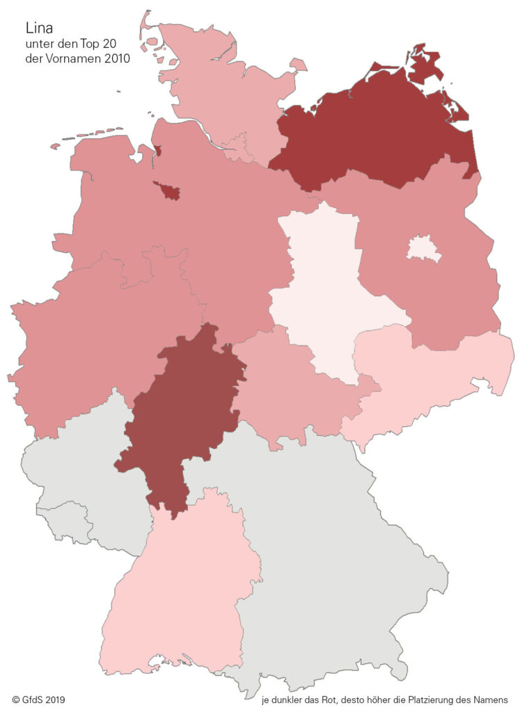 Je dunkler der Farbton, desto höher die Platzierung innerhalb der Top Ten. Grau gefärbt sind jene Bundesländer, in denen der Name nicht unter den Top Ten steht.