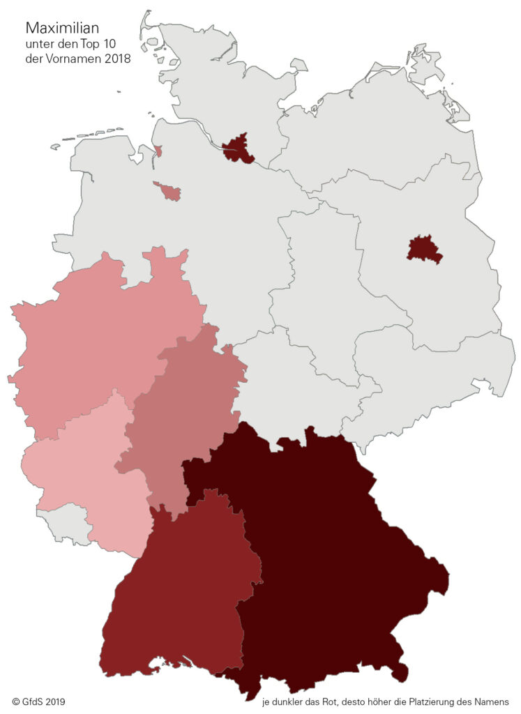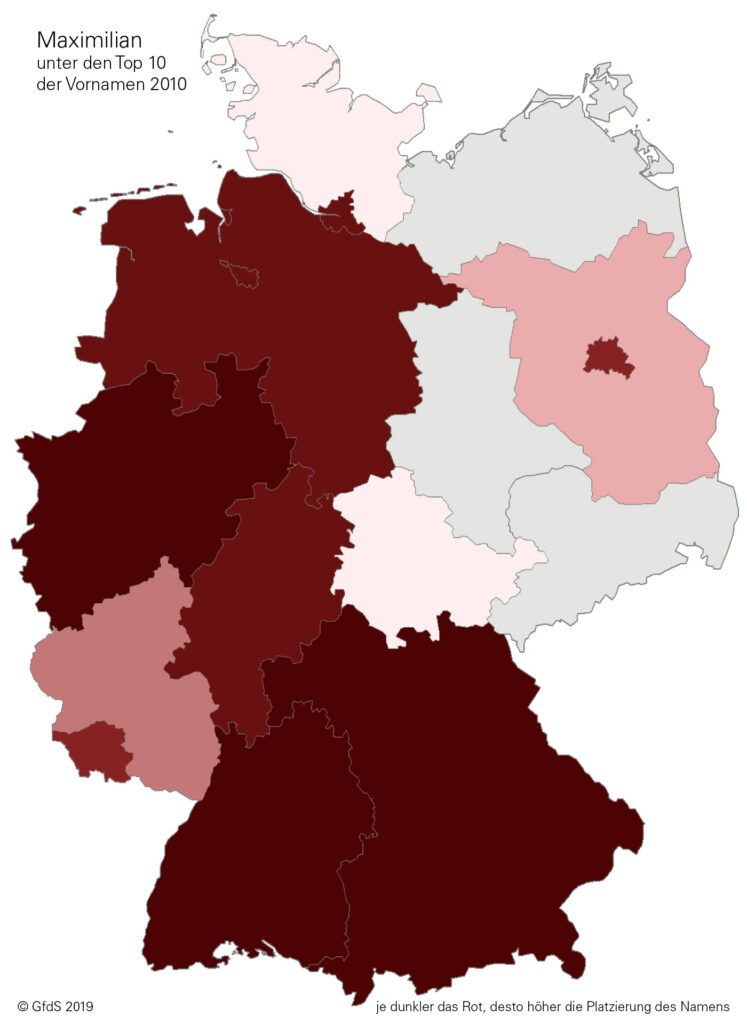 Je dunkler der Farbton, desto höher die Platzierung innerhalb der Top Ten. Grau gefärbt sind jene Bundesländer, in denen der Name nicht unter den Top Ten steht.