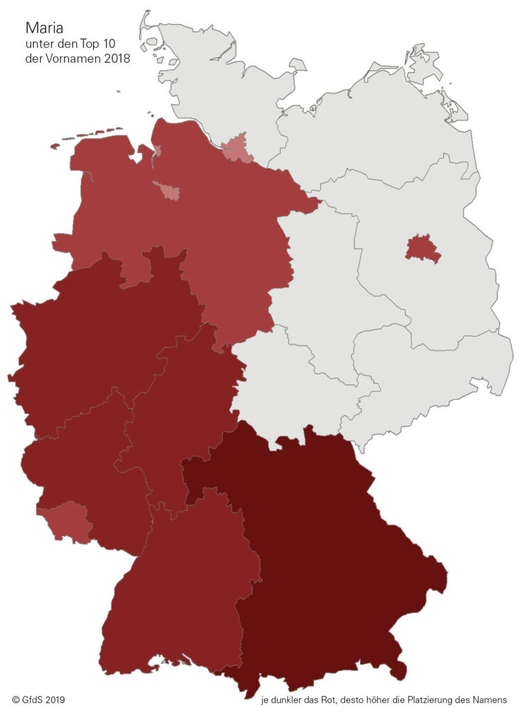 Je dunkler das Rot, desto höher die Platzierung innerhalb der Top Ten in den einzelnen Bundesländern. In den grau gefärbten Gebieten steht der Name nicht unter den Top Ten.