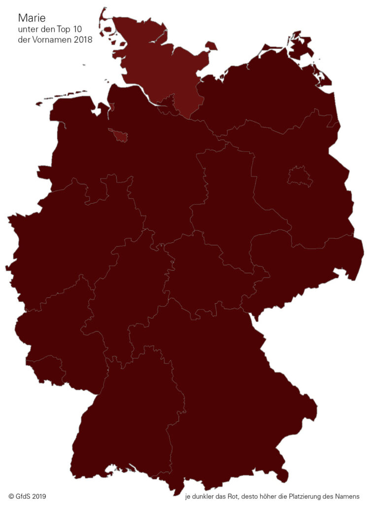 Bei Doppelnamen (Bindestrichnamen) stehen beide Varianten äußerst hoch im Kurs: Mehr als ein Drittel der 2018 vergebenen Doppelnamen (Namensformen [= Types], nicht Einzelzählungen [= Tokens]) wiesen als ersten oder – deutlich häufiger – als zweiten Bestandteil Marie oder Maria auf: Anna-Maria, Lisa-Marie, Mia-Marie, Marie-Luise, Marie-Sophie etc.
